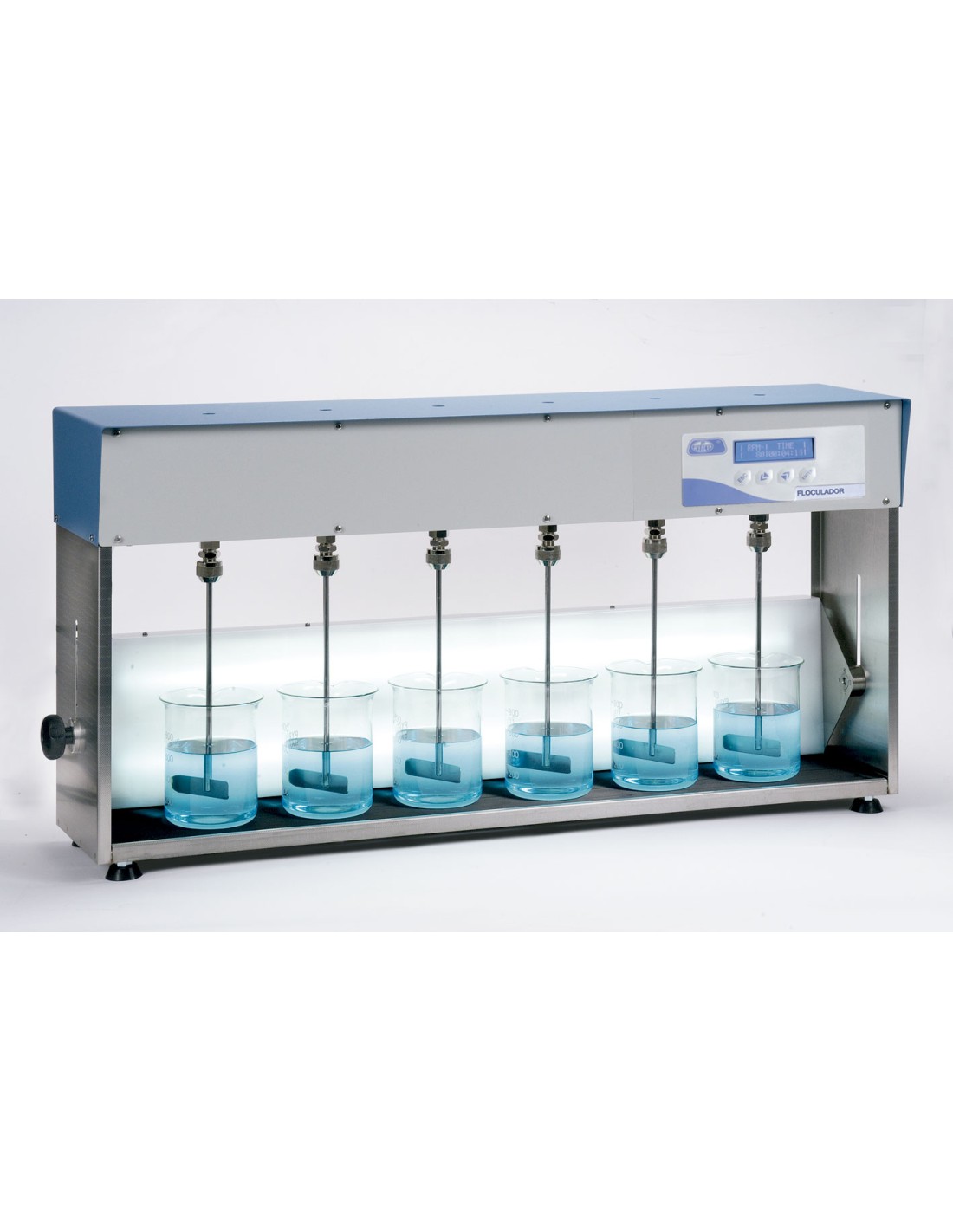 Para la determinación de los agentes floculantes necesarios para conseguir la sedimentación. Regulación electrónica digital de la velocidad y del tiempo de funcionamiento. Nuevo sistema de iluminación. Par máximo por cada unidad de agitación 40 Ncm. Viscosidad máxima 30.000 mPas. APLICACIONES Permite optimizar la adición de coagulantes y polielectrolitos para el tratamiento de aguas de superficie y residuales.Evaluación de la eficacia de un absorbente sobre agentes tóxicos.Polivalente.Sin transmisiones por correa.Por su potente par de giro permite agitar y mezclar sustancias de alta viscosidad. CARACTERÍSTICAS Equipo de agitación de 6 plazas que permite acoplar vasos hasta 1000 ml forma alta ó 2000 ml forma baja.Regulación electrónica digital de la agitación desde 15 a 200 r.p.m.De funcionamiento silencioso.Tiempo de funcionamiento regulable de 1 a 999 minutos o en continuo.Varillas agitadoras forma pala fija en acero inox. AISI 304, fácilmente intercambiables y regulables en altura.Elemento de iluminación ajustable en altura por medio del sistema de fijación original SELECTA, que permite fijar indistintamente en posición posterior o en posición base.para conseguir distinto ángulo de iluminación del ensayo.Con el código 3000821 y 3000823, según modelo, que se suministran como accesorios se obtiene la simultánea iluminación inferior y posterior.Mueble superior esmaltado en epoxi; lateral y base en acero inox. AISI 304 con pies soporte en caucho antideslizante. PANEL DE MANDOS 1. Pantalla alfanumérica. Indica revoluciones por minuto y tiempo.2. Pulsador invalidar parámetro.3. Pulsador disminuir valor parámetro.4. Pulsador aumentar valor parámetro.5. Pulsador validar parámetro.