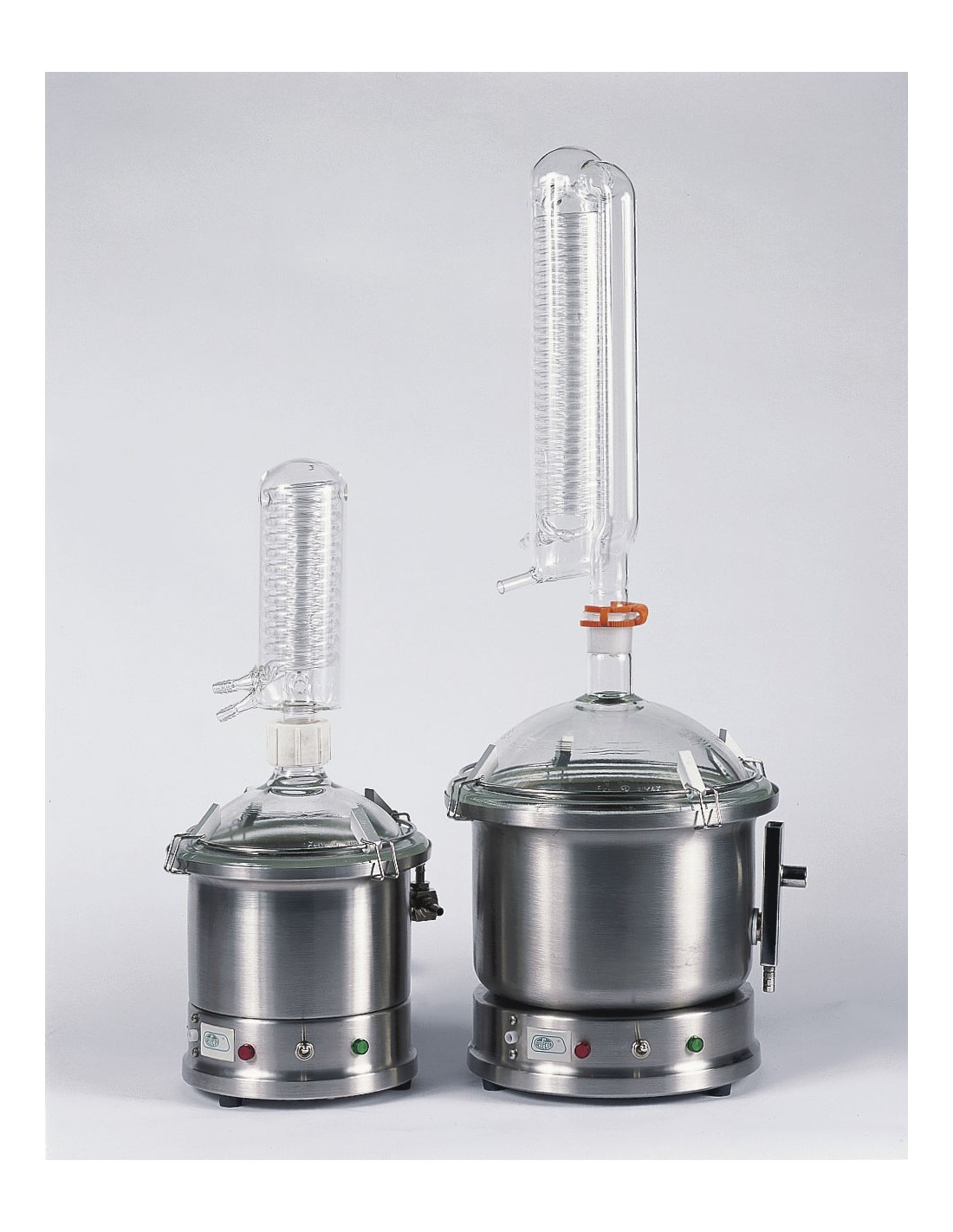 Capacidad de destilación: 6 litros/hora. Estructura inox-vidrio de fácil apertura para su limpieza y conservación CARACTERÍSTICAS De simple manejo, destinados para uso continuo de agua destilada. Calderín y elemento calefactor en acero inox. AISI 304, con tapa y condensador en vidrio borosilicato, unidos por dispositivo de cierre a presión de quita y pon original Selecta. Dispositivo de seguridad de sobretemperatura por falta de agua. Producción de agua destilada libre de pirógenos. Se suministra completo con conexiones de silicona.