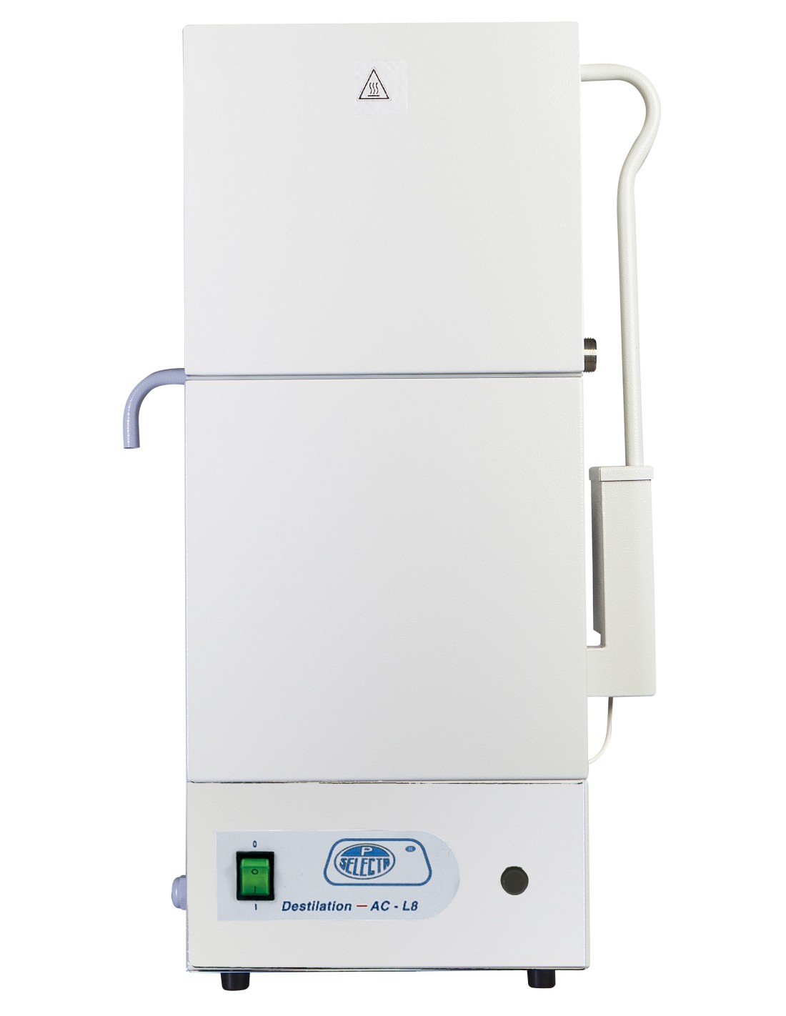 CAPACIDAD DE DESTILACIÓN: 8 LITROS/HORA CARACTERÍSTICAS Mueble refrigerante y elementos calefactores en acero inoxidable. Exterior en acero inoxidable protegido con esmalte epoxi. Fácilmente desmontable para su limpieza. Sellado con junta de silicona. Dispositivo de seguridad por sobrecalentamiento y protección para bajo nivel de agua. Racores de alimentación del agua de 3/4’’. Tubo de agua destilada de Ø 12 mm. Voltaje: 230 V / 50-60 Hz. PANEL DE MANDOS Interruptor general con luz de señalización. Pulsador de rearme del termostato de seguridad.