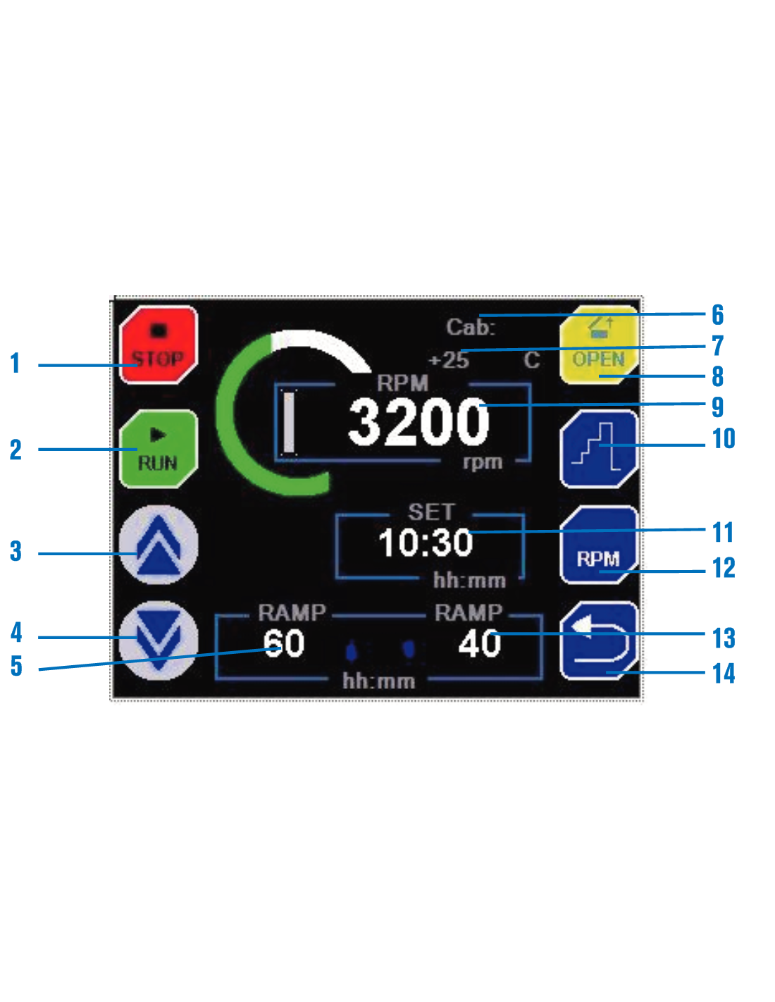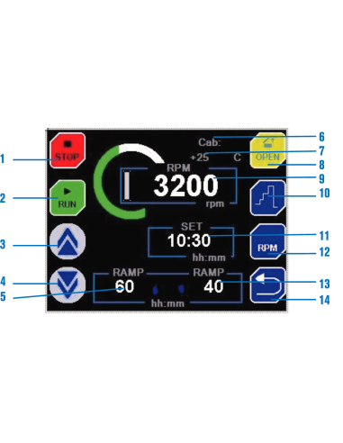 Capacidades hasta 800 ml. Con motor de inducción libre de mantenimiento. CARACTERISTICAS Motor de inducción libre de mantenimiento. Nivel sonoro 50-60 dBA. Construcción enteramente metálica: - Mueble exterior fabricado en aleación de Dur-Al. - Cubeta interior y contratapa en acero inox. - Cámara de seguridad de acero, entre la cubeta interior y el mueble. Circuito electrónico digital gobernado por microprocesador para el control de todos los parámetros de funcionamiento: velocidad, aceleración, freno, RCF, tempera-tura, tiempo, almacén para 10 programas diferentes, identificación de cabezal y alarmas de funcionamiento. Cabezales, vasos y adaptadores debidamente identificados con un sistema de grabado inalterable por láser para su óptima elección. Sistema de circulación de aire para las centrífugas sin refrigeración, para limitar aumentos excesivos de temperatura en el interior de la cubeta con la mínima resistencia. Todo el aire que circula por la cubeta está debidamente canalizado hasta una salida posterior. Grupo compresor hermético, montado sobre acoplamiento antivibratorio con evaporador circundante a la cubeta interior de la centrífuga (sólo centrífugas refrigeradas). Sensor de identificación de cabezal, que al cerrar la tapa de la cámara del rotor, comunica al microprocesador todos los límites de funcionamiento del cabezal, evitando así antes de la puesta en marcha cualquier riesgo de fallo en el momento de la programación de dichos parámetros. Este sistema es un método abierto de identificación que nos permite la posibilidad de ampliar la gama de cabezales en cada modelo de máquina. Mueble exterior en aleación DURAL y cubeta interior estampada en acero inox. AISI 304. PANEL DE MANDOS 1. Tecla para detener el proceso. 2. Tecla para iniciar el proceso. 3. Tecla incrementar valor. 4. Tecla disminuir valor. 5. Rampa de aceleración programada. 6. Código del rotor instalado. 7. Lectura de la temperatura en tiempo real. (sólo los modelos refrigerados). 8. Tecla de apertura de la puerta. 9. Lectura en tiempo real de las RPM o RCF. 10. Funcionamiento secuencial. 11. Tiempo programado en el proceso. 12. Tecla para cambiar RPM/RCF. 13. Rampa de frenada programada. 14. Tecla de retorno
