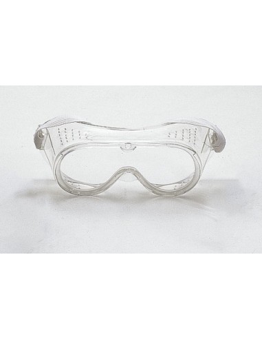 Ideal para el trabajo en laboratorios. Según norma EN-166. Panorámica. Permite usarse sobre sus gafas correctoras. Construida en plástico transparente y flexible que se amolda completamente. Sujeción elástica ajustable. Ventilación lateral indirecta.