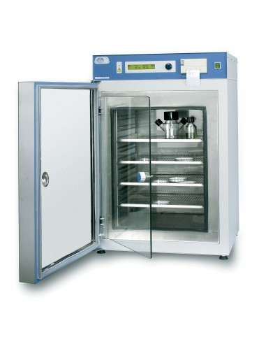 Regulación por microprocesador y lectura digital de temperatura y co2. Para temperaturas regulables desde ambiente +5 °c hasta 50 °c. Estabilidad: ±0,2 °c, a 37 °c. Homogeneidad: ±0,5 °c, a 37 °c. Resolución: 0,1 °c. Rango de alarma: desde ambiente +5 °c hasta 50 °c. Resolución: 0,1 °c. Rango co2: del 0 al 20%. Estabilidad: ±0,3%. Resolución: 0,1%. SEGURIDAD: NORMA DIN 12880. UN SEGUNDO CONTROLADOR DE TEMPERATURA INDEPENDIENTE ASEGURA LA PROTECCIÓN DE SOBRETEMPERATURA. DESVÍO DE CONSIGNA DE CO2. INDICADOR DE PUERTA ABIERTA. INDICADOR DE FALTA DE ENERGÍA ELÉCTRICA. INDICADOR DE FALTA DE PRESIÓN DE CO2. Sensor de CO2 por infrarrojo. Función esterilización cámara. CARACTERÍSTICAS Cuerpo exterior de acero esmaltado al horno en epoxi y con aislante térmico alrededor de la cámara útil. Cámara interior de acero inoxidable con soporte para estantes, fácilmente desmontable, para facilitar la limpieza interior de la cámara. Doble puerta. Una interior, de vidrio templado con junta de silicona, y otra exterior, de acero con cierre magnético debidamente calefactada para evitar condensaciones en la puerta de vidrio. Cierre de las puertas suave, evitando cualquier vibración en el interior de la cámara. La toma de CO2 se efectúa por la parte posterior, mediante terminal metálico para tubo de Ø 6 x 4 mm. Salida RS-232 para lectura e impresión de parámetros por ordenador. REGULACIÓN Y CONTROL Control electrónico digital de la temperatura y del CO2 mediante botón monomando y pantalla LCD que facilita la puesta en marcha y funcionamiento de la cámara. CONTROL DE LA HUMEDAD El grado de humedad dentro de la cámara es constante, del orden del 98% H.R. y producido directamente por evaporación del agua que hemos introducido previamente en el fondo de la cámara. PANEL DE MANDOS 1. Indicador óptico de estado de alarma.2. Display LCD indicador de parámetros. 3. Botón monomando multifunciones.4. Impresora (opcional).5. Interruptor de puesta en marcha. Se suministra con dos bandejas. * 2025 W en modo esterilización.