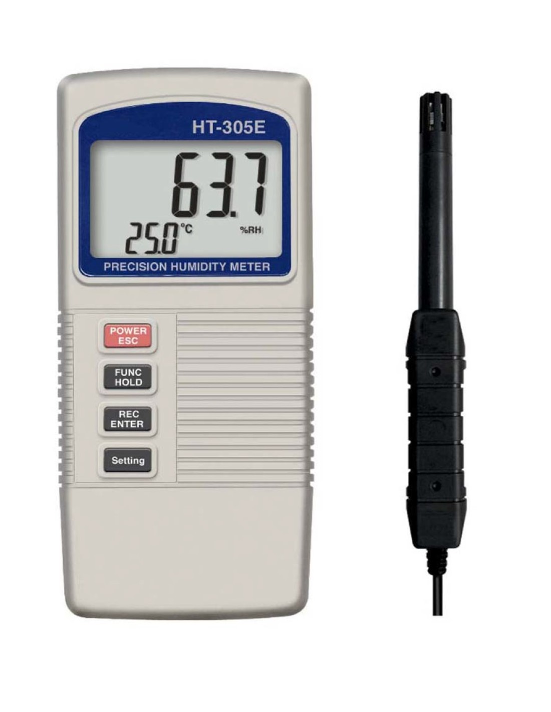 CARACTERÍSTICAS Rango de temperatura desde 0 °C hasta 60 °C. Rango de humedad desde 10% hasta 95% RH. Lectura digital en °C o en °F de respuesta rápida: 0,4’’. Alimentación: batería 9 V. Medidas (alto x ancho x fondo): 3,2 x 6 x 13,25 cm. Peso: 264 g. Se suministra completo con sensor de humedad / temperatura, funda protectora y estuche.